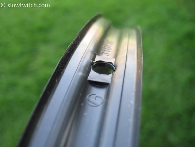 Be sure to put the valve in right away (i.e. before you start putting the rim tape all the way around the rest of the rim). This will keep the valve hole in the rim strip lined up with the valve hole in the rim. Also be sure to tighten the nut down very snug.