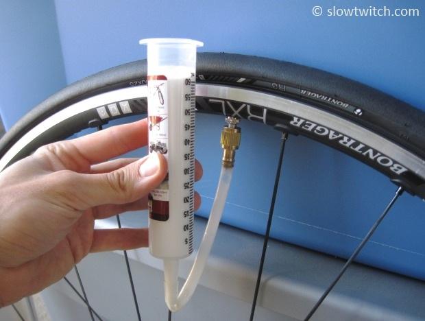 I then brought out the new Bontrager sealant. They say this stuff is latex-based and free of ammonia, so it will not cause corrosion or rot your tires. It is a proprietary mix, which they say evaporates slower than the competition, and you do not need to use as much volume – only one ounce per road tire.