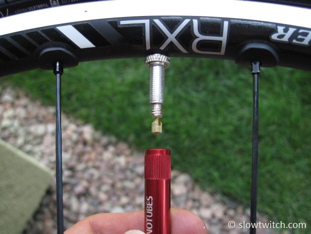 After the test pump (sans sealant), I deflated the tire, and removed the valve core with my trusty Stan’s core removing tool: