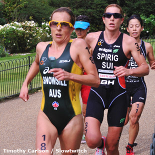 They decided to do the actual training that worked with Snowsill – intense runs, more run mileage and more times running per week. They also cut back on her swim and bike training. Spirig, as Snowsill had done with Sutton, ran nearly every day, sometimes twice a day. “I believed if Nicola could cope with that, that she could out sprint Emma,” said Sutton. While the increased run training may well have been the underlying reason, Spirig incurred a stress fracture that led to a periosteum strain while training at a [non-Sutton] camp in southern Switzerland in late Fall of 2010.