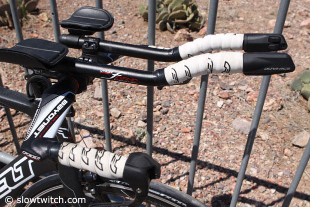 This Felt Bayonet 3 handlebar is quite adjustable and the Shimano Dura-Ace Di-2 shifters control the Ultegra Di-2 derailleurs.