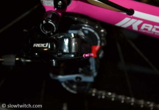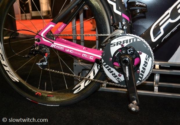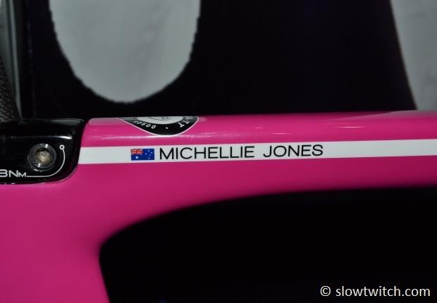 Michellie rides a full SRAM Black Red drivetrain and Quarq crankset (complete with pink chainring bolts).