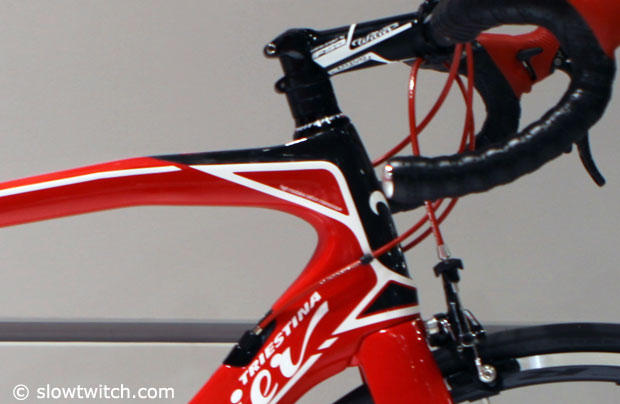 A closer look at the tapered 1 1/8 to 1 1/4 head tube of the Cento 1SR and the transition to the down tube.