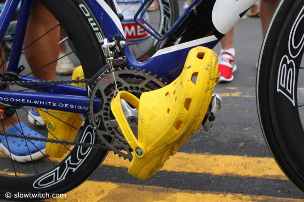 Yes, this man will do the bike segment in Crocs, and then use a different pair of them for the run.