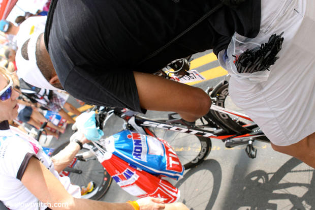 Richard Lockley from the Von Drais company adjusts a bike race number.