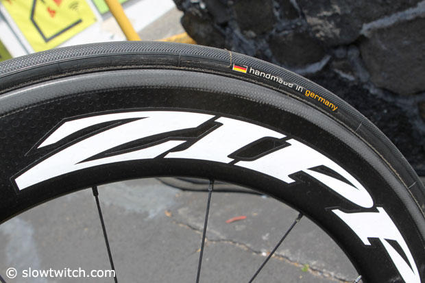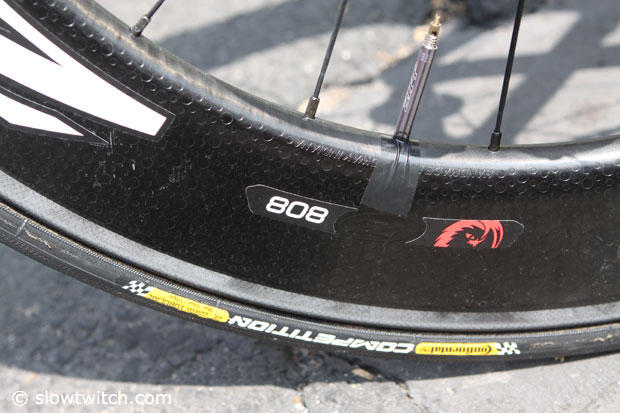 Up front another Zipp 808 Firecrest with Continental Competition tires.