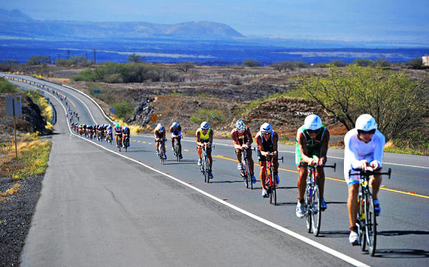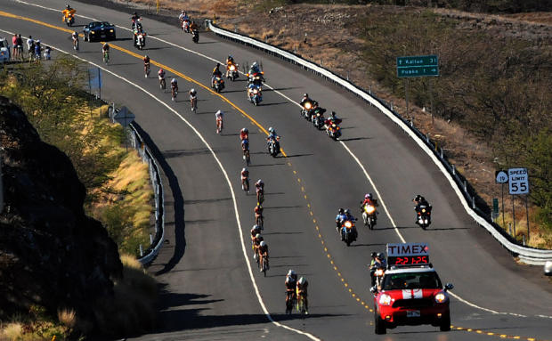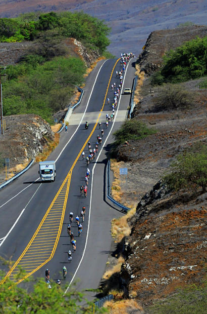 Hundreds of age groupers rode in a mostly legal nose to tail formation nearing Kawaihae.