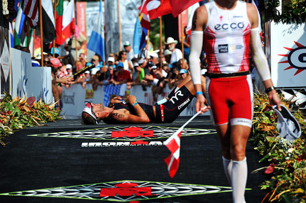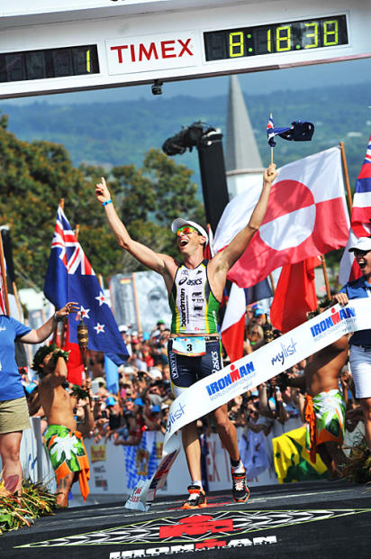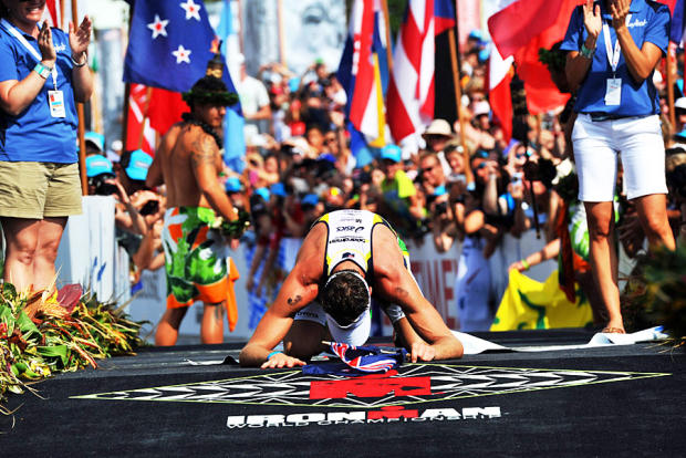 Pete Jacobs bows in thanks at the finish. While Craig Alexander faded to 12th and Chris McCormack DNF'd, Jacobs extended the Australian men's domination of Kona to 6.