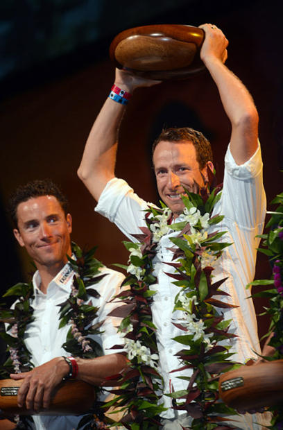 Pete Jacobs exults at the awards as runner-up Andreas Raelert looks on with sportsmanlike appreciation