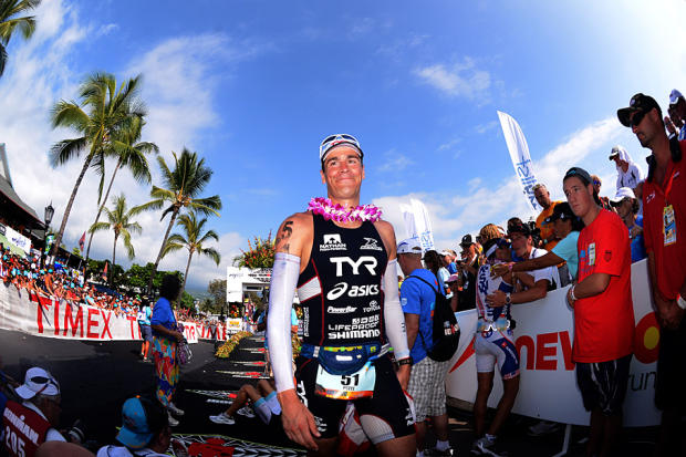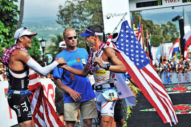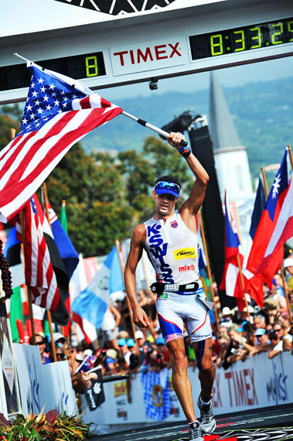 Timothy O'Donnell waves the flag for his first top 10 Kona finish.