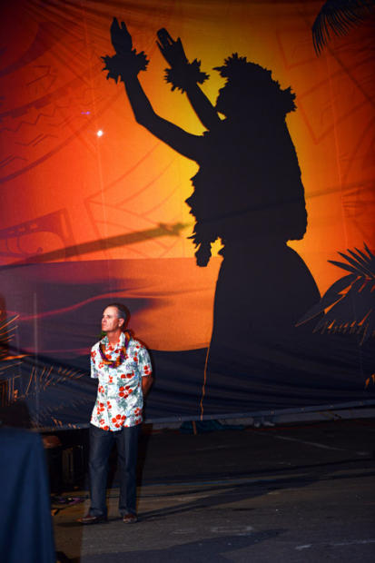 Voice of Ironman Mike Reilly takes an off stage moment beneath a Hawaiian icon.