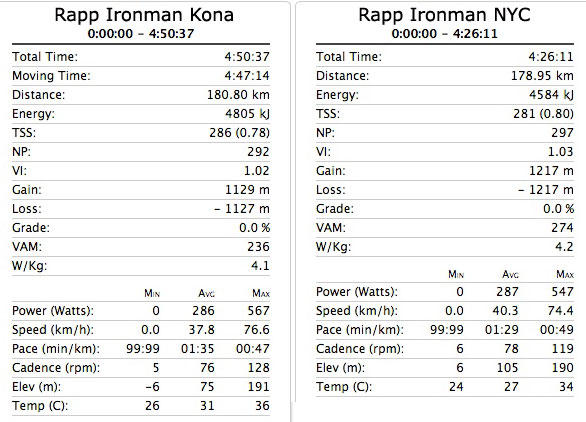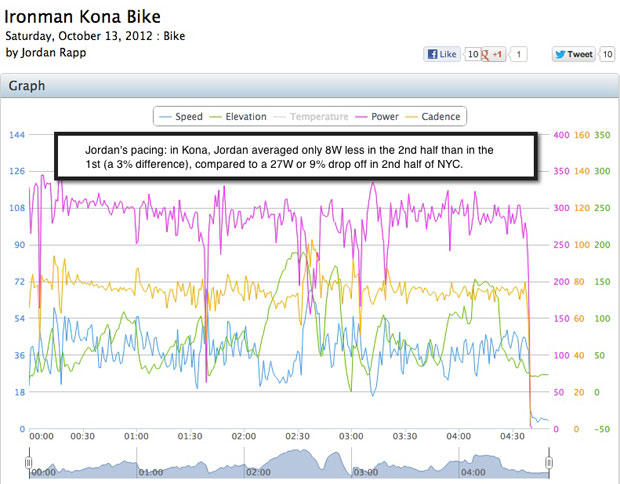 This past Saturday was 2012 Ironman US Champion Jordan Rapp’s first trip to Kona. Jordan has been kind enough to share both his winning Quarq power file from New York, as well as his power data from Kona. TrainingPeaks compared the two files within their software, and provided the following analysis between Rapp’s NYC and Kona rides.