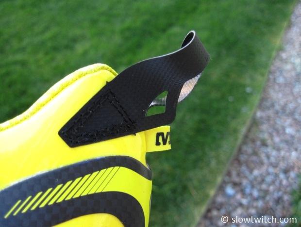 The rear of the shoe also features a generous sized finger loop for quick transitions. Note the small supplemental loop, specifically made for a rubber band (for those who pre-install their shoes on the pedals for a flying-bike-mount).