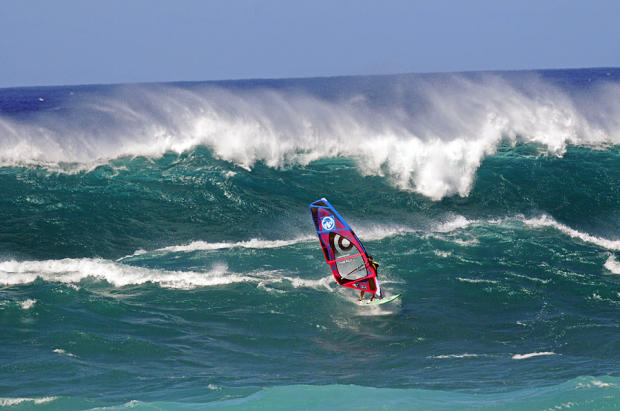 Just 35 miles away from the XTERRA race site at Kapalua, wind surfers compete on 10 foot waves at an international contest at Hookipa.