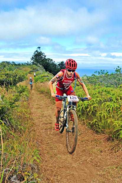 Danelle Kabush of Canada rides a ridge 1,200 feet above the beach at Kapalua.