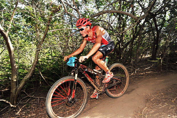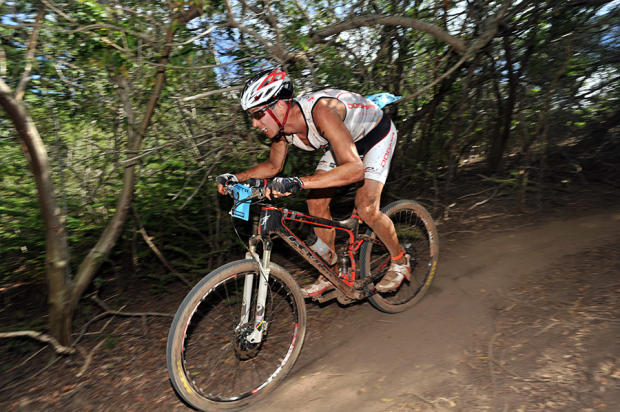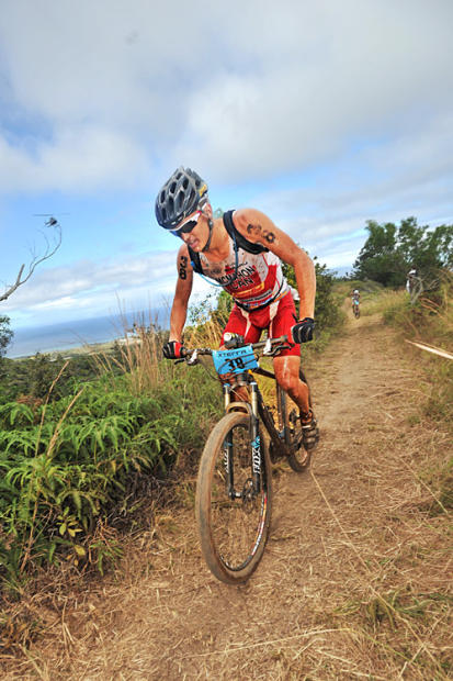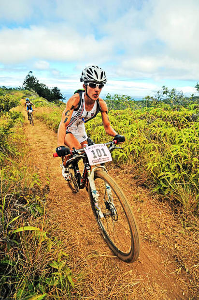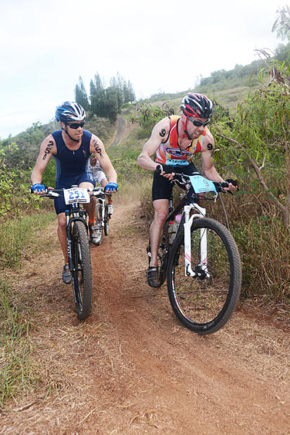 Pro Mike Vine fights his way past an age grouper on a narrow trail.