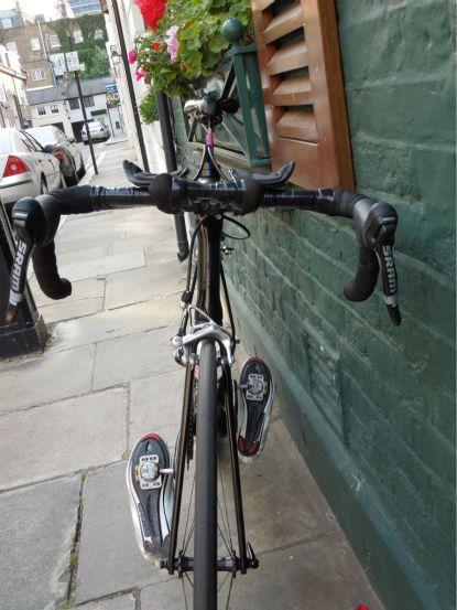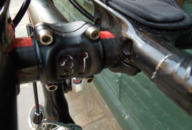 A photo of the front Rolf Prima TDF 6sl with only one logo of IOC ruling size. Also notice the bar end cap even has tape on it to cover a logo.