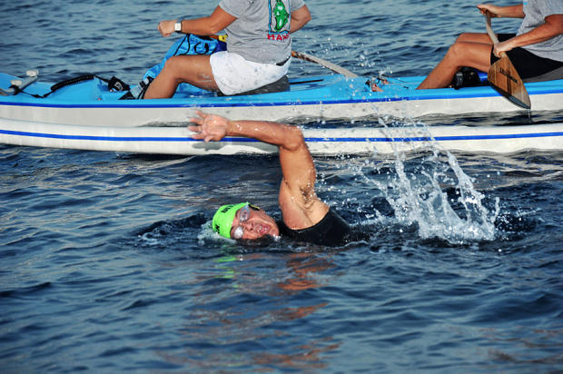 Swimmers are supported by kayakers.