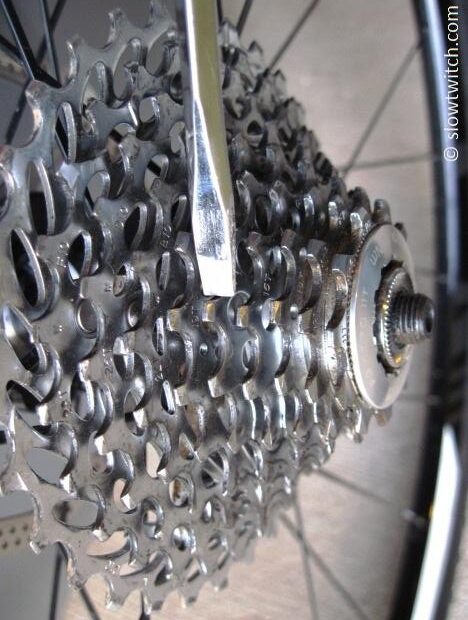 These notches present a problem when trying to remove your cassette; the middle cogs get jammed in to place, and you can’t pull them off. The easiest solution is this – take a shop rag, place it over the cassette, and try to force the stuck cogs counterclockwise – out of their notches. If that doesn’t work (i.e. your freehub is really bad), there is a two-person method. Person 1 holds the cassette with a rag. Person 2 carefully takes a flat head screwdriver, and places it against a tooth of the stuck cog. Then they gently tap the handle of the screwdriver with a hammer.