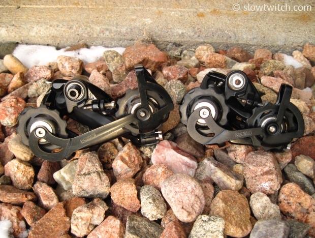 This also begins to explain why drivetrain manufacturers make different length cages for rear derailleurs. For example, let’s look at two SRAM derailleurs. On the left, we have an Apex mid cage derailleur. On the right, a Rival short cage derailleur.
