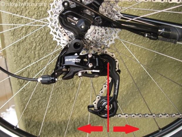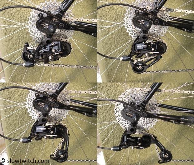Notice how the derailleur cage becomes more extended – travels further to the right – as the chain wraps around more and more gear teeth.