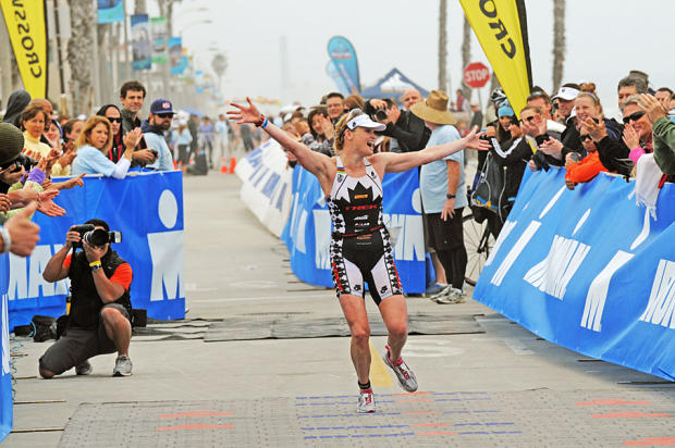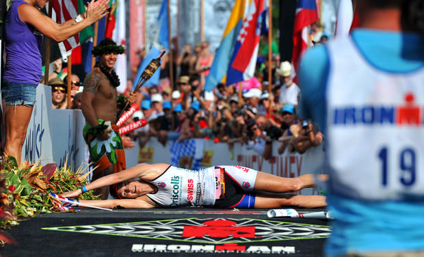 Leanda Cave honors the inspiring bravery of the late Jon Blais with her Blazeman roll after winning Ironman Hawaii.
