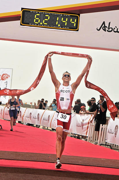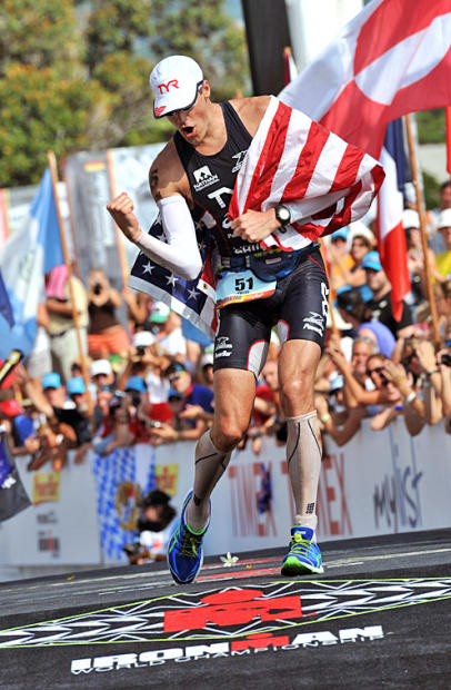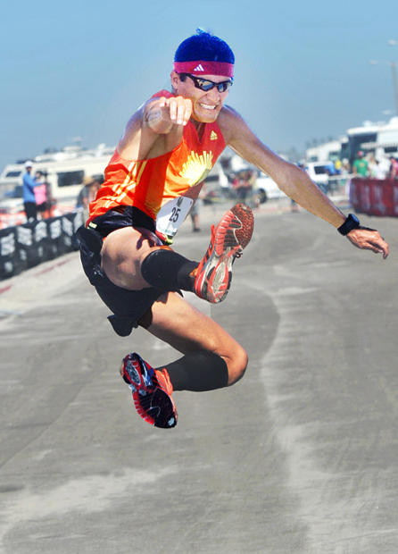 The usually quiet and unassuming Javier Gomez strikes a pose after winning the XTERRA World Championship in his first off road triathlon foray.