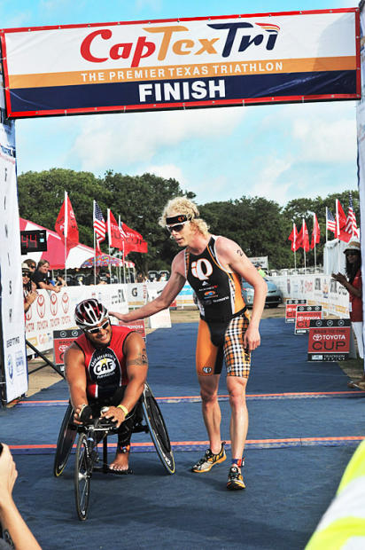 Cameron Dye offers congratulations to a fellow finisher at CapTex.