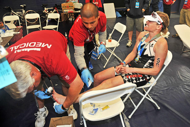 Melanie McQuaid is treated for blisters after her win at Oceanside 70.3.