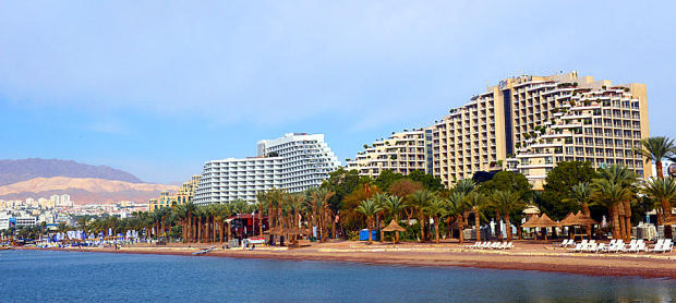 The Royal Beach area of Eilat looking past large resort hotels to the swim start.