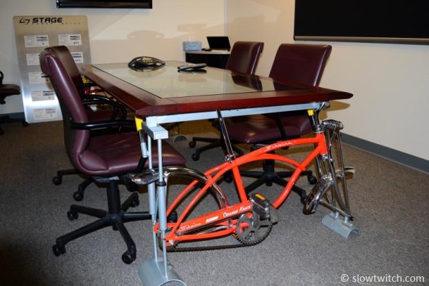 This is a fun conference room table. The glass table top even has carbon wheels underneath it.