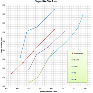 What did this mean in terms of the bikes he could ride? I’m recommending for Maik a rather shortish stem of about 90mm to 100mm, which is in line with what triathletes tend to best ride, that is, Maik would ride a 120mm stem or thereabouts on his road race bike, but on his tri bike he’ll ride a stem roughly 2cm shorter. Assuming he is to ride an aerobar that has its pads about 60mm above the centerline of the pursuit bar, what would be the frame geometry that would fit underneath all of this, if that stem did not rise in pitch, and if we were talking superbikes that have no headset spacers, etc.?
