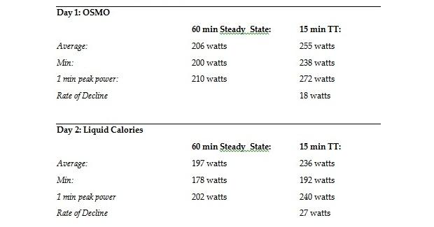 For one trial, we were to ingest Osmo Active plus solid or semi-solid food. The second trial was liquid or gel calories of our choosing (whatever we would normally use). Fluid and calorie intake were both standardized based on body weight.