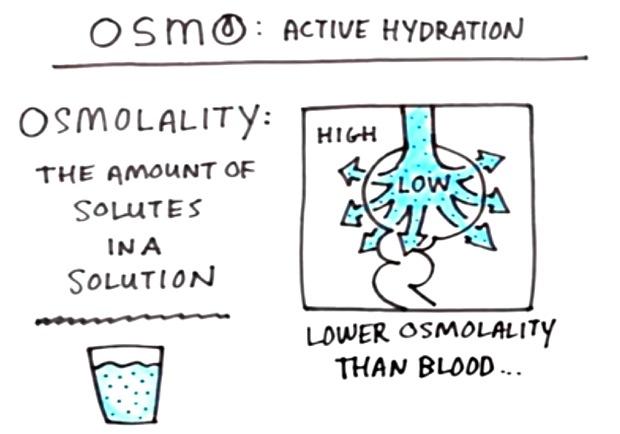 The concept behind Osmo Active is to optimize this fluid travel inside our intestines, so we can become better hydrated (or less dehydrated). They key, according to Sims, is as simple as making the concentration of the drink lower than that of the blood. She states that blood plasma osmolality is normally in the range of 285-290mOsm (milli-osmoles), assuming you are sufficiently hydrated. As such, we want our sports drinks to be below 280mOsm.
