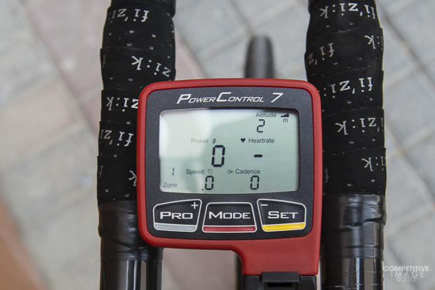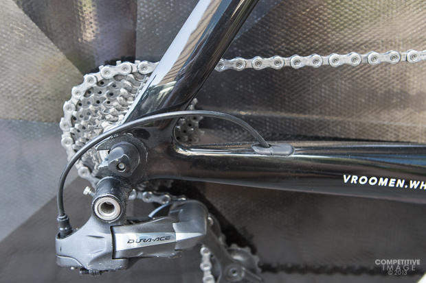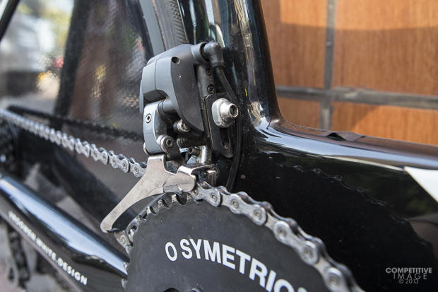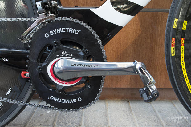Osymetric chainrings on a Shimano Dura-Ace SRM power meter crank and Magura hydraulic brakes.