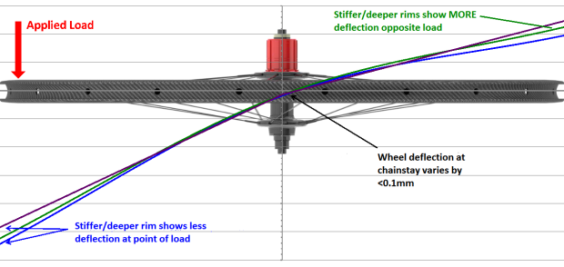 As you can see, the deeper and stiffer rims deflect less at the point of load (the road surface). However, they deflect more on the opposite side – where the brake caliper sits on a normal road frame.