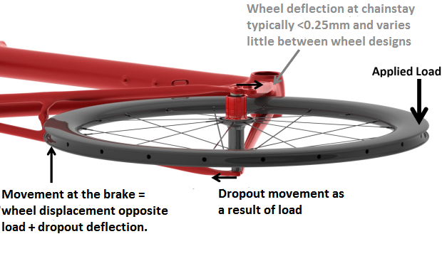They also mentioned that the wheel’s movement in the dropouts acts as a multiplier of sorts, and is affected by the alignment of the dropouts themselves, and the stiffness of the bike’s chainstays and seatstays. If the frame is weak, the wheel will move more between the brake pads.
