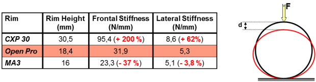 The reference rim is a shallow section Open Pro aluminum rim (18.4mm rim depth). The CXP30 is 30.5mm deep, and the MA3 is 16mm deep. As you can see, the CXP30 is the stiffest, both radially and laterally.