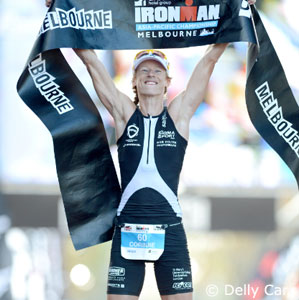 After a windswept weather-shortened swim, to 1.5k, a gaggle of Aussies led through the early stages of the 180k cycling leg of the Asia Pacific Championship event in Melbourne. The Belgian Marino Vanhoenacker quickly made up a roughly 2 minute swim disadvantage to join the Aussie party on the first of two laps of the bike course. Shortly after beginning the second lap Vanhoenacker employed the same strategy that seemed certain to work last year in Kona — until it didn’t — quickly putting space between himself and all followers. It looked as if the tall Belgian had figured out the pacing a little better this time, especially with the cooler temperatures that even featured an occasional drizzle.
