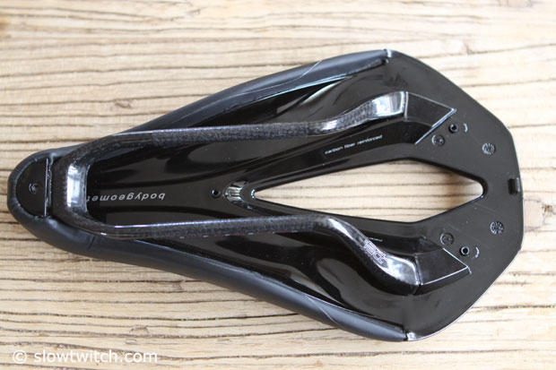 As we look below at the saddle without any attachment, we can see the mounting points and carbon rails.
