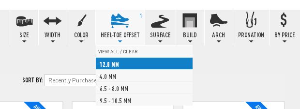 The main reason I chose Brooks is because their website offers a wonderful tool for picking shoes. You can narrow down your search by adding in as many filters as you want – including Ramp Angle (which they call heel-to-toe offset):