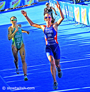 Anne Haug of Germany, who won the first round of the 2013 World Triathlon Series two weeks ago in Auckland, overcame a slow swim with a chase pack bike and a 3rd-fastest 33:26 run to grab 4th place and retain her lead in the WS points chase. Fourth place Olympian Sarah Groff of the U.S.A. led the swim with a 17:29 split in the Mission Bay waters and led a 4-woman breakaway that included Moffatt, Carolina Routier of Spain and Pamela Oliveira of Brazil) into T2 with a with an 8th-best 1:06:42 split but lost the lead after the first of three laps on the run. Groff went into a damage-control 35:46 run that left her 7th, 56 seconds behind 5th-place Jodie Stimpson of Great Britain and 5 seconds behind 6th-place Andrea Hewitt of New Zealand.