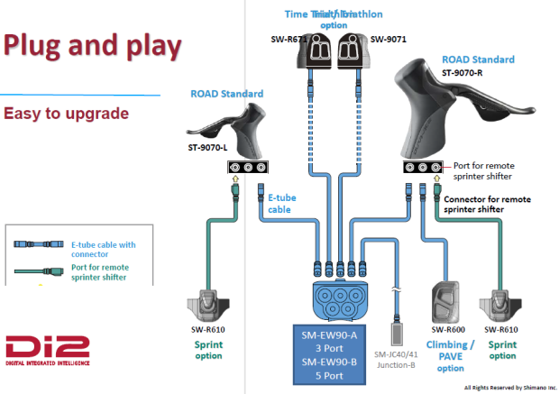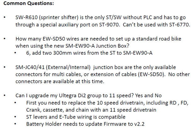 Having sifted through all of this information and attending the Shimano press event, I think the most important upgrade for Ultegra 6770 Di2 owners is to add the new 9070 brake levers and a 5-port junction box. As it stands, Ultegra 6770 ONLY has bar-end shifters. There are no auxiliary shift buttons on the brake levers. That – in my mind – is the key feature that triathletes want on their bikes; whether or not the rear cassette is 10 or 11 speeds is of secondary importance. If you have an existing bike with Ultegra 6770, all you need are the 5-port junction and brake levers, and you have the least expensive entry to dual-position electronic shifting.