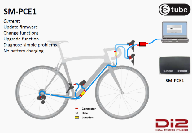 There are a couple ways to plug your bike in to your computer, each with some unique features. Upon initial release, Shimano offered the SM-PCE1. This is effectively the consumer-level diagnostic device. It allows you to update component firmware, change functions, and do basic diagnostics.