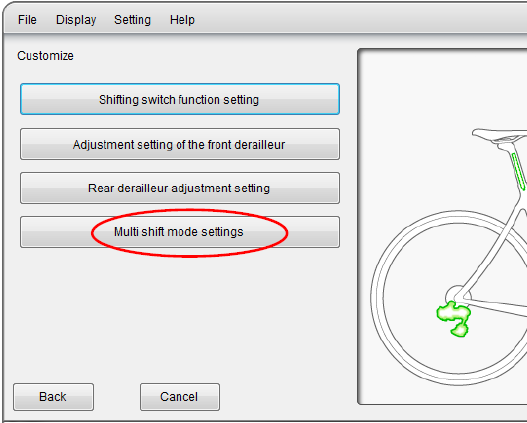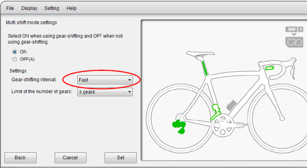 Multi-shift is a function that is new for 9070. Simply put, when you hold down a shift button, it will continue to shift the rear derailleur (rather than pushing the button five times for five shifts). The speed and number of shifts is completely programmable, which is what we will show you.