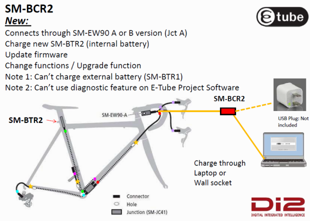 The newer and heavier-duty option is the SM-BCR2. The cool feature with this is that it allows you to charge the new internal battery option without removing it from the bike (rejoice, aero-electronics weenies). All you do is plug in to the junction box and connect it to your computer with the USB cable, or a USB wall adapter (i.e. from an iPhone). Note that you cannot charge the external battery in this manner; you must use the existing wall charger for that.