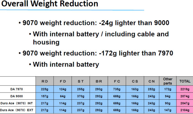 While I don’t normally talk a lot about weight and price very much, I think they are a notable part of this discussion. Shimano provided the following spreadsheet that details the weight reduction of new 9070 Dura Ace Di2: