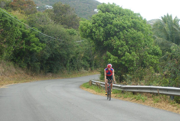 Riding in St. Croix is on the left side of the road.  It is useful to do a bit of riding to get bearings for those of us from nations that drive on the right.  The pavement often has many parts that are upgraded for race week, but there are parts that are rough too.  Use practice rides to be aware of this.  Also on the first and last loop, there is a decreasing radius high-speed downhill that comes on the way back in to town.  Several of the grades on the course are also very deceptive.