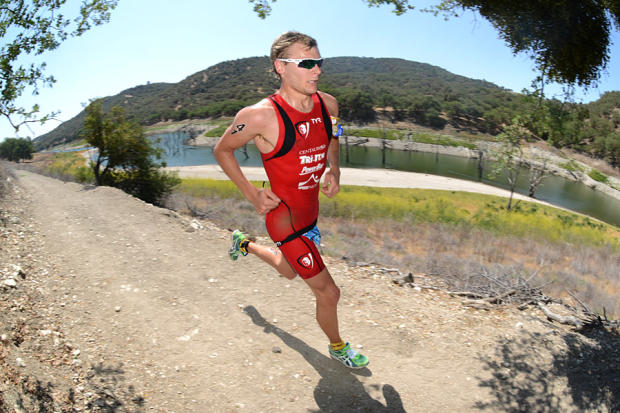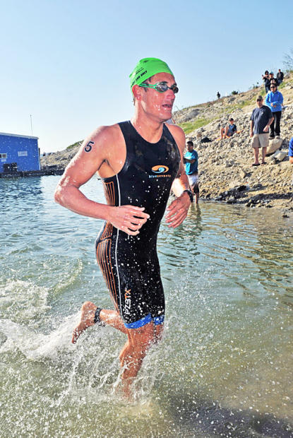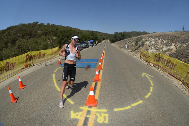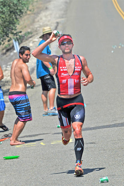 Clayton Fettell was first out of the swim, led the bike for 35 miles, then fell off the back.