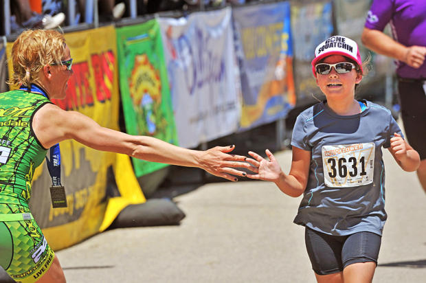 After taking care of her interview duties, women's winner Heather Jackson touches hands with age mountain bike age group finishers.